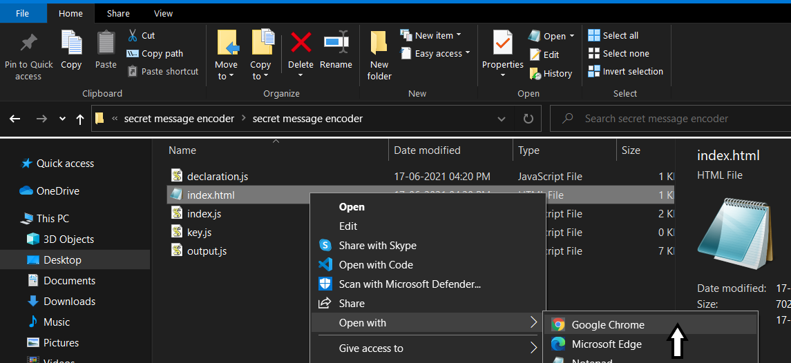 copy this This is the key to decoding your message. If this goes into the wrong hands then, your secret messages will no more be secret. Go back to the folder where this file was and open key.js in notepad